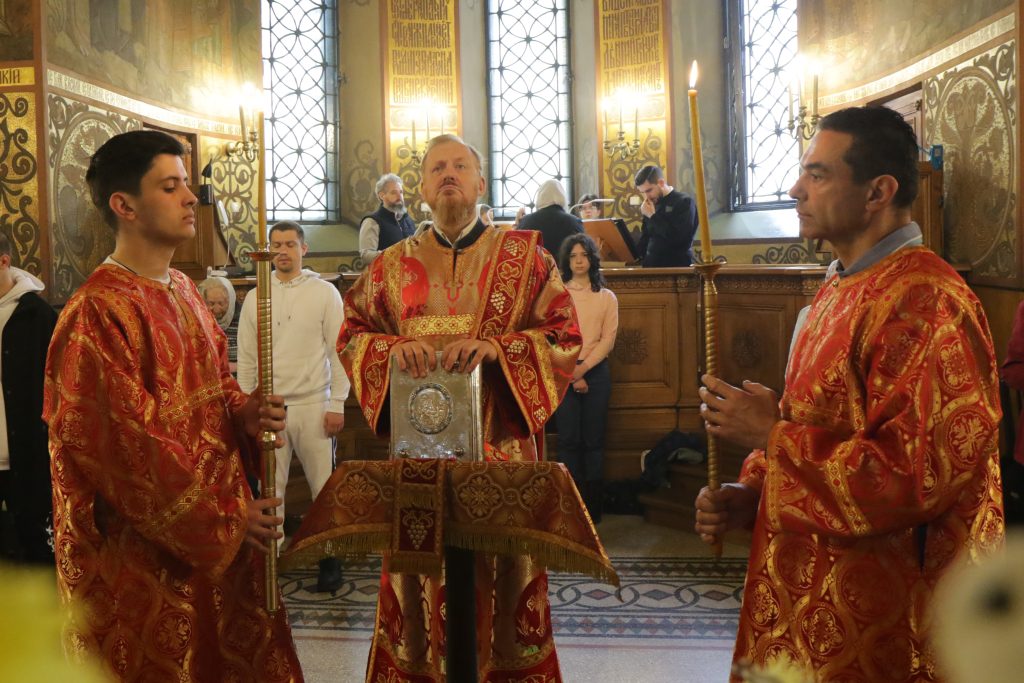 В Светлый Четверг, Божественную литургию на Патриаршем Подворье совершил протоиерей Алексий Максименюк  в сослужении клириков храма святого великомученика Пантелеимона иерея Серафима Желева и диакона Александра Морозова.